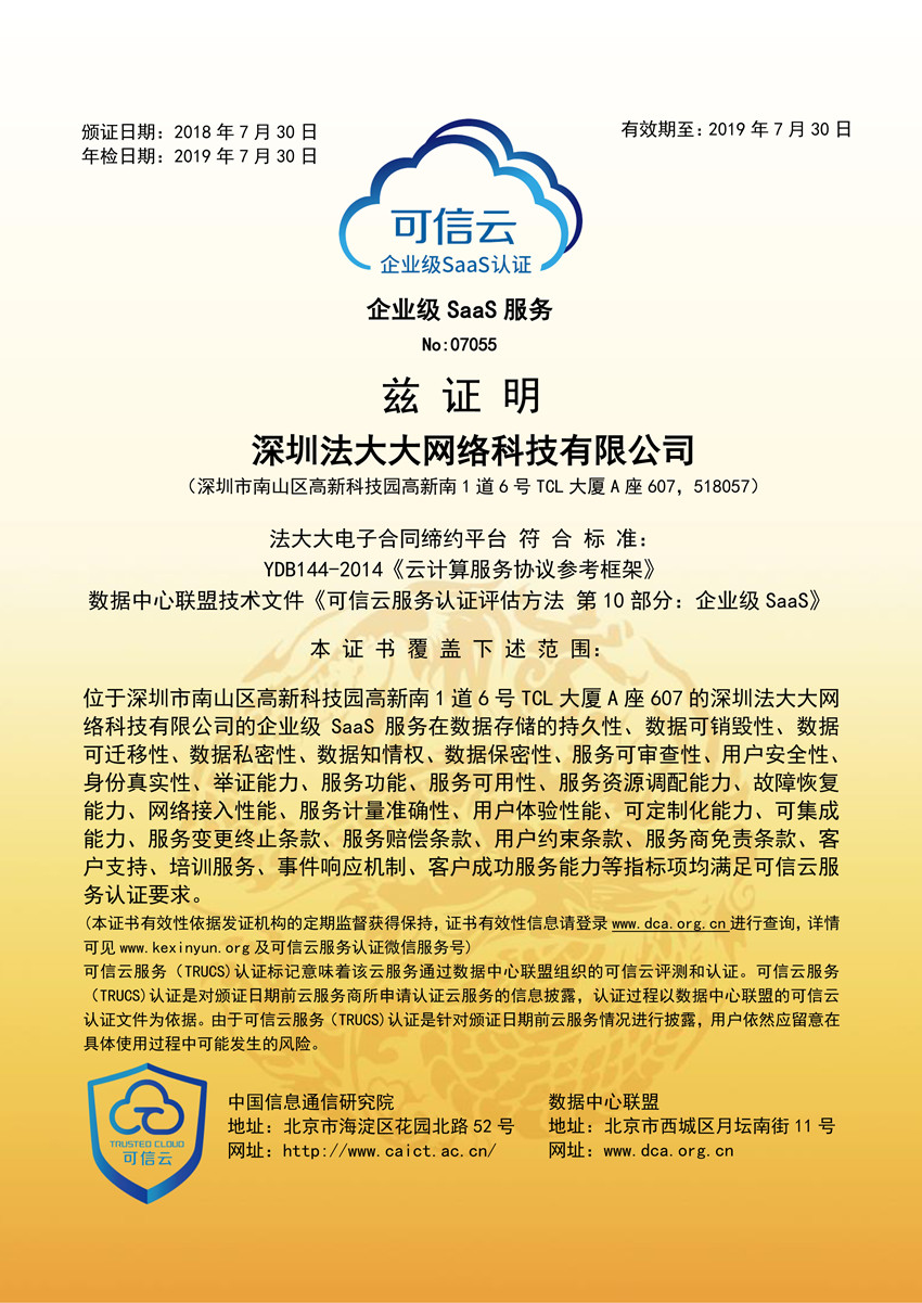 工信部“可信云”认证报告指出,法大大企业级SaaS服务在数据存储的持久性、数据可销毁性、数据可迁移性、数据私密性、数据知情权、数据保密性、服务可审查性、用户安全性、身份真实性、举证能力、服务功能、服务可用性、服务资源调配能力、故障恢复能力、网络接入性能、服务计量准确性、用户体验性能、可定制化能力、可集成能力、服务变更终止条款、服务赔偿条款、用户约束条款、服务商免责条款、客户支持、培训服务、事件响应机制、客户成功服务能力等指标项均满足可信云服务认证要求。
