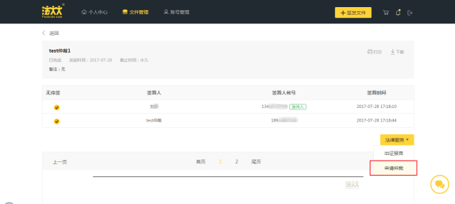 以法大大电子合同平台为例,用户点击“申请仲裁”后(即一键仲裁功能,仅适用于签发时已勾选相关选项的文件,如下图),将进入广州仲裁委员会(下称广仲)的系统进行网络仲裁,仲裁时间可由原来的最长6个月缩短至22个工作日左右。