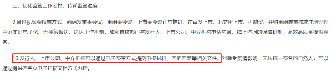 比如深交所在《关于支持实体经济若干措施的通知》中明确:“允许采用电子签章办理业务。因受疫情影响,在提交IPO、再融资、并购重组申报文件或信息披露文件时无法统一签名或盖章的市场主体,可以通过提供签字页电子扫描文档、电子签章等方式办理业务,提升业务办理效率。”